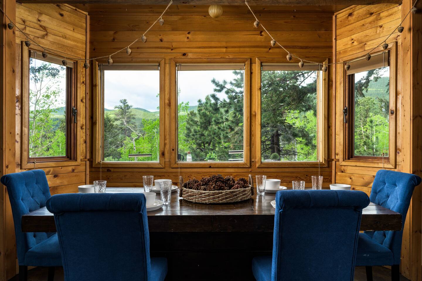 Experience a whimsical escape at our castle-style cabin nestled in Evergreen's serene pines. Relish in the comfort of a private Finnish sauna, and let the ambiance of cozy reading nooks embrace you. This retreat, perfect for families, couples, or groups, offers tranquil forest views and modern luxuries. Whether relaxing or enjoying a meal together, create cherished memories here. Book your relaxing mountain retreat today!